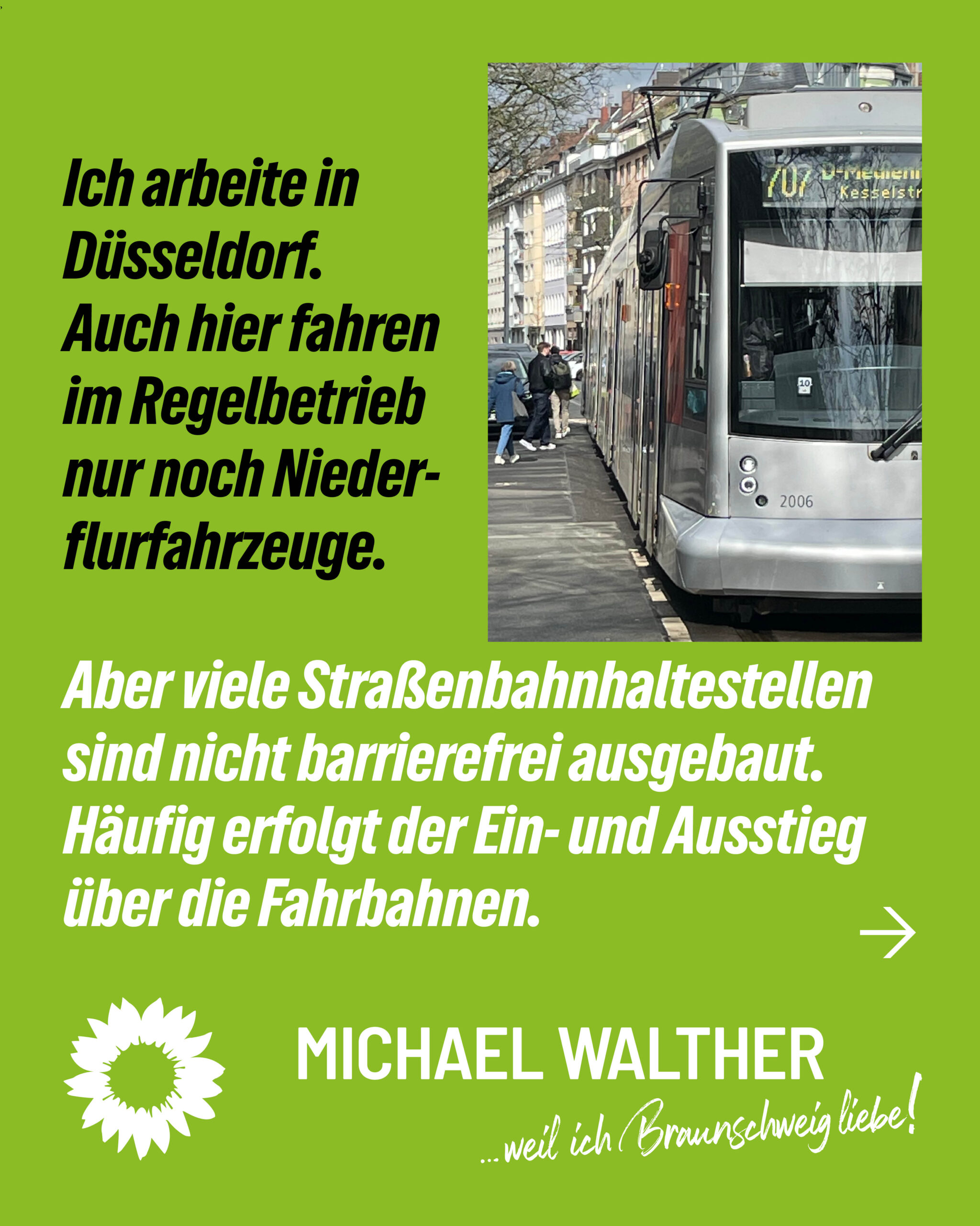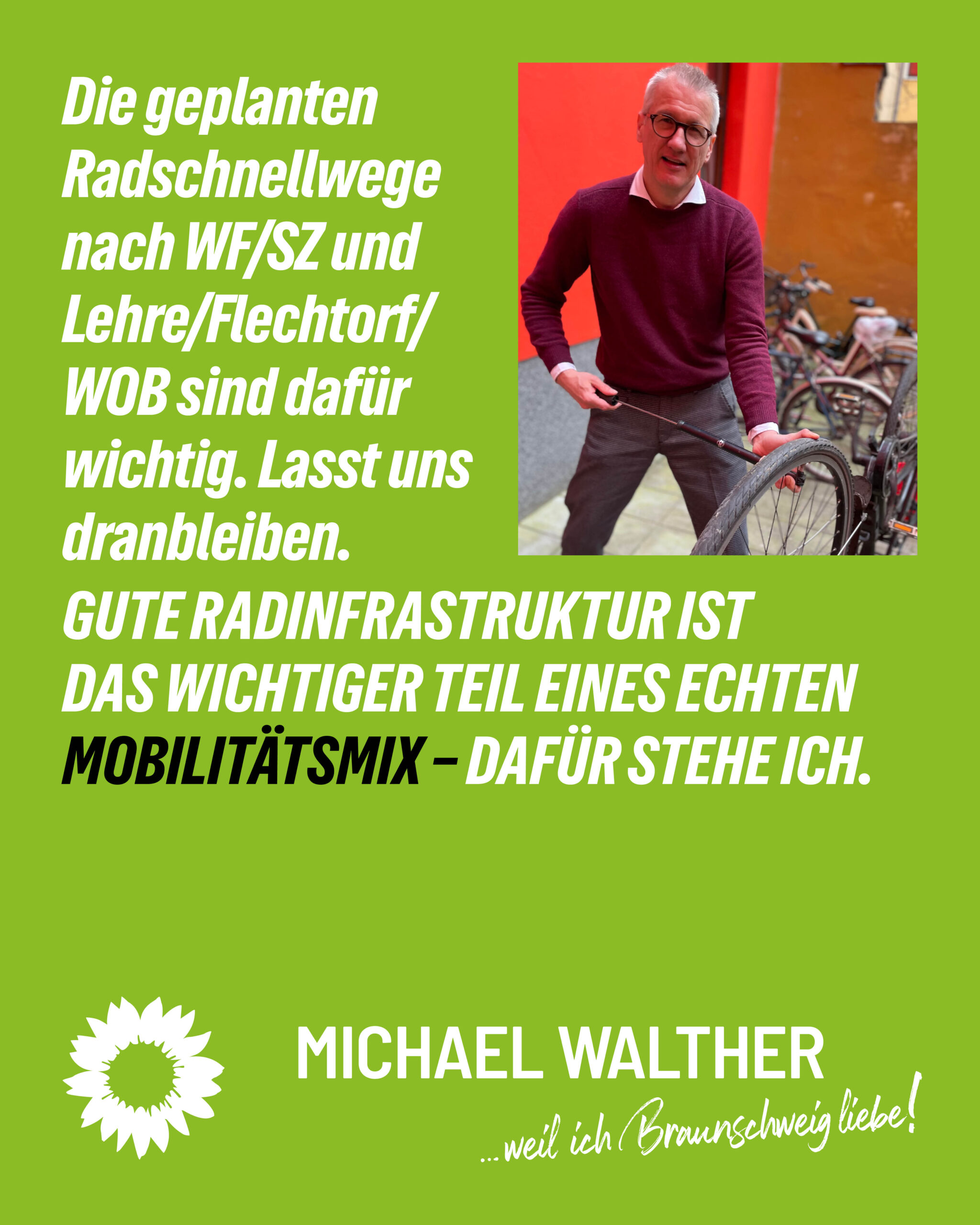 Mein Ziel ist ein funktionierender Mobilitätsmix. Das ist nicht nur ein Konzept, sondern soll unser Alltag werden. Autos, Radfahrende, Fußgängerinnen und Fußgänger sowie der ÖPNV teilen sich begrenzten Raum. Sicherheit und gegenseitige Rücksicht müssen dabei an erster Stelle stehen. Alle haben das Recht, sicher ans Ziel zu kommen. Das erfordert faire Kompromisse bei der Verteilung von Verkehrsflächen und Investitionen.